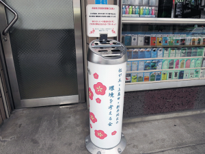 当店では、たばこを吸われる方と吸わない方が共存できる街づくりを目指した活動に協賛しています。店頭には、地元のお寺(梅照院)の梅の紋をデザインしたオリジナル灰皿を設置しております。また商店会内には約10カ所の灰皿を設置しております。歩行喫煙はご遠慮頂き、お近くの灰皿を是非ご利用下さい。